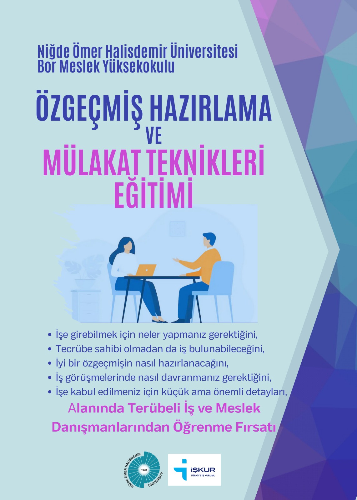 Öğrencilerimize İŞ-KUR tarafından Özgeçmiş Hazırlama ve Mülakat Teknikleri (CV Hazırlama Eğitimi) verildi. Böylelikle öğrencilerimiz CV hazırlama konusunda çalışma hayatlarında mutlaka kullanacakları bilgi sahibi oldular.