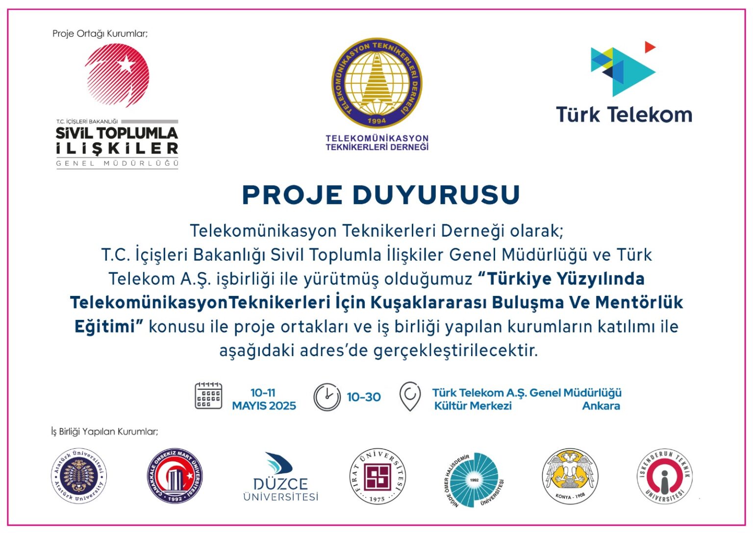 T.C. İçişleri Bakanlığı Sivil Toplumla İlişkiler Genel Müdürlüğü ve Türk Telekomünikasyon A.Ş. işbirliği ile Telekomünikasyon Teknikerleri Derneği (TTD) tarafından 10.05.2025-11.05.2025 tarihlerinde Türk Telekom A.Ş. Genel Müdürlüğü'nde gerçekleştirilen "Türkiye Yüzyılında, Telekomünikasyon Teknikerleri İçin Kuşaklar Arası Buluşma ve Mentörlük Eğitimi"ne Bölümümüz Elektronik Teknolojisi Programından 3 öğrencimiz katılmıştır.
