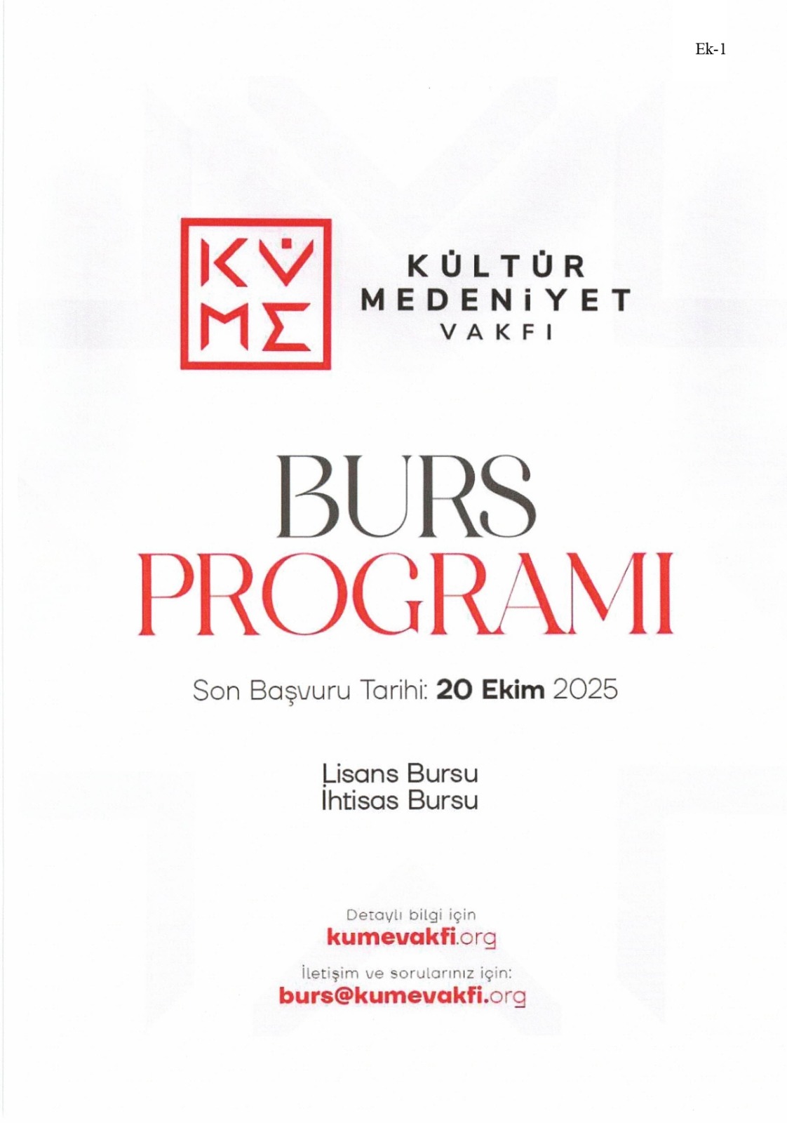 Kültür Medeniyet Vakfı Burs Programı 16.10.2025 Kültür ve Medeniyet Vakfı Burs Başvuruları başlamıştır. Detaylı bilgi ve başvuru için tıklayınız. Son Güncelleme Tarihi : 16.10.2025