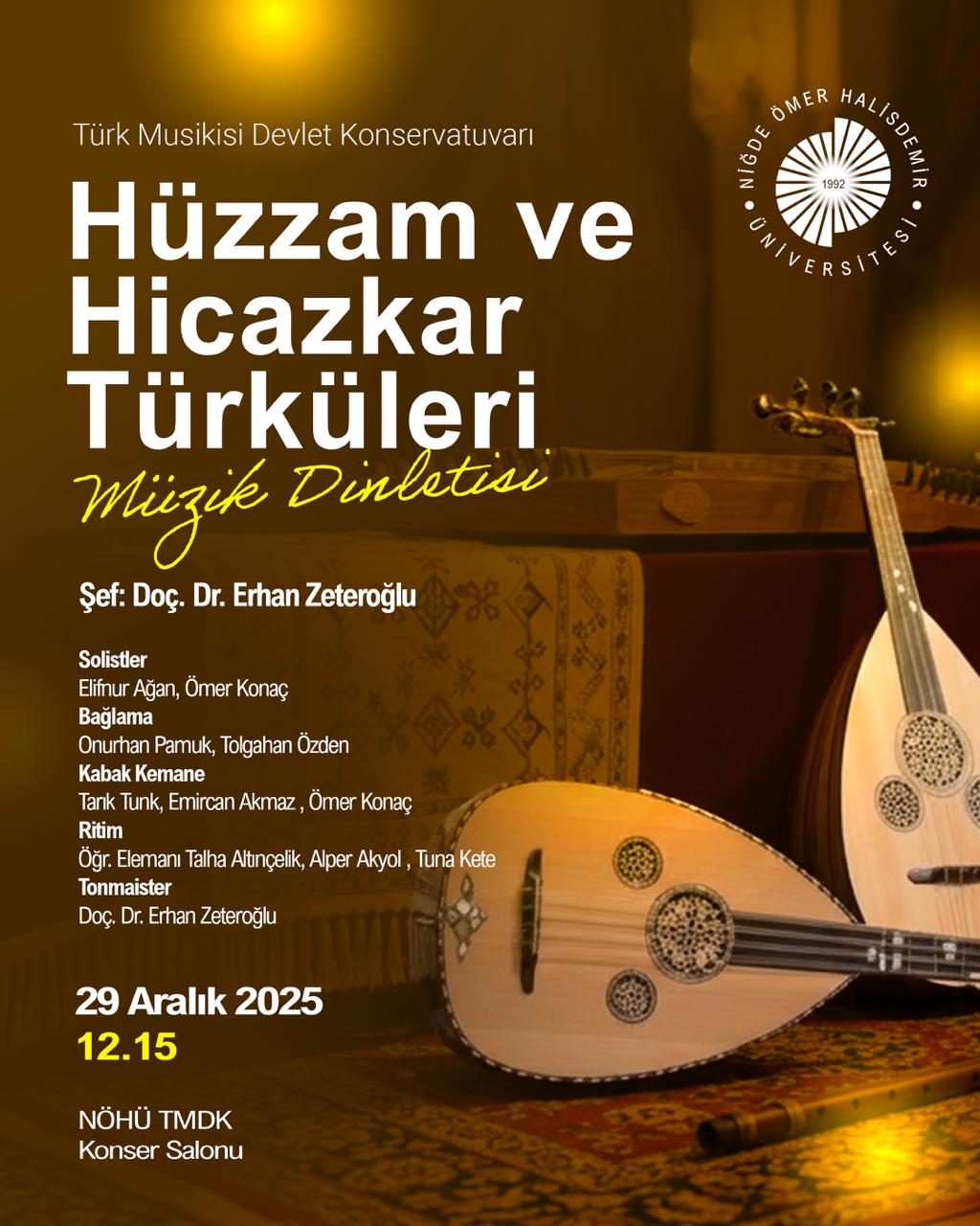 Hüzzam ve Hicazkar Türküleri Müzik Dinletisi Etkinlik Ayrıntıları Etkinlik Adı: Hüzzam ve Hicazkar Türküleri Müzik Dinletisi Etkinlik Tarihi: 29.12.2025 - 29.12.2025 / 12:15 Etkinlik Türü: Konser Etkinlik Yeri: Türk Musikisi Devlet Konservatuvarı Konser Salonu Türk Musikisi Devlet Konservatuvarı Konser Salonu Son Güncelleme Tarihi : 24.12.2025