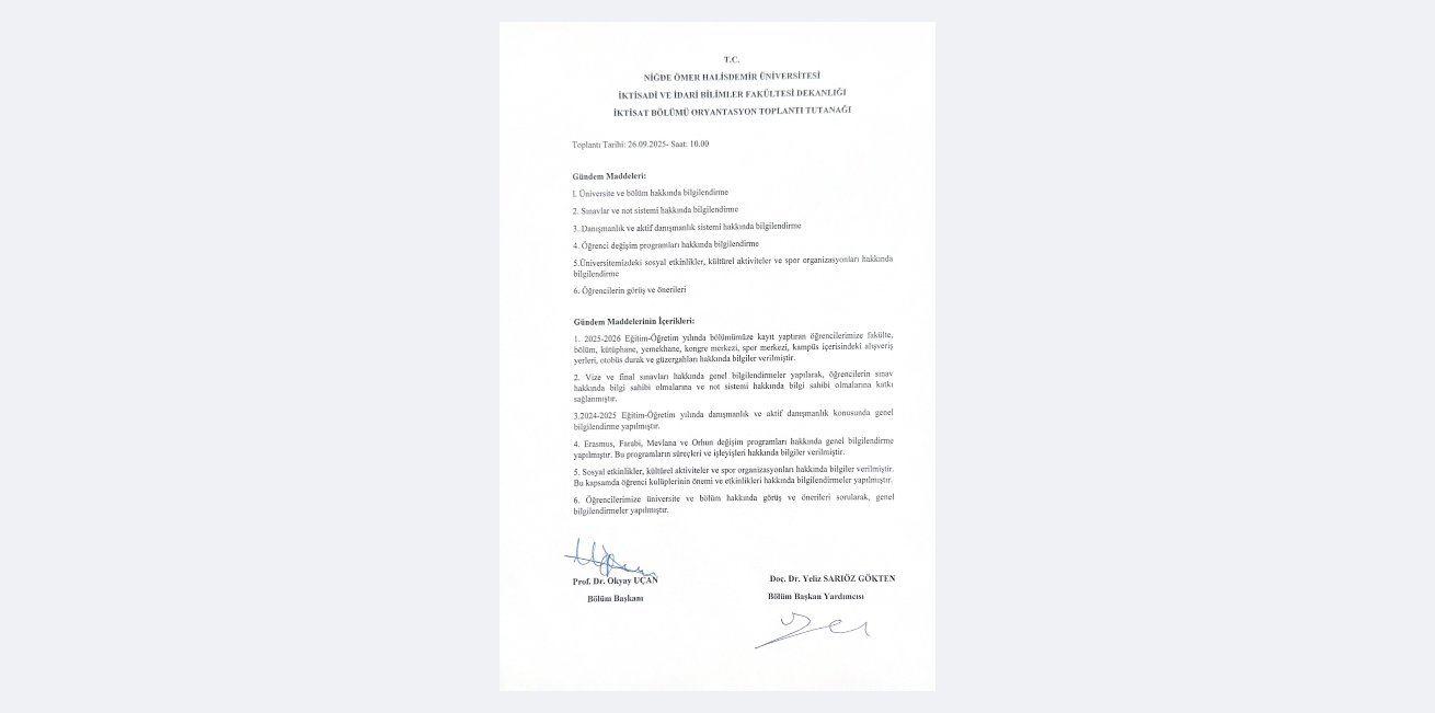 26.09.2025 tarihinde, Sayın Bölüm Başkanımız Prof. Dr. Okyay UÇAN’ın katılımıyla İktisat Bölümü 1. Sınıf Oryantasyon Programı gerçekleştirilmiştir. Program kapsamında, Fakülte Dekan Yardımcısı Prof. Dr. Fındık Özlem ALPER ve Bölüm Başkan Yardımcısı Yeliz SARIÖZ GÖKTEN öğrencilerimize yönelik bilgilendirici konuşmalar yapmıştır. Ayrıca bölüm araştırma görevlileri Arş. Gör. Dr. Hilal BUDAK BİÇER ve Arş. Gör. Emine Dilara AKTEKİN GÖK öğrencilerimize fakülte ve kampüsü sunum yaparak tanıtmışlardır.