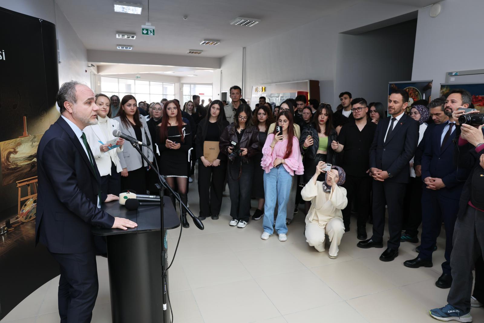 Üniversitemiz Rektörü Prof. Dr. Hasan Uslu, açılışta yaptığı konuşmada öğrencilerin ortaya koyduğu çalışmaları desteklemeyi sürdüreceklerini dile getirdi. Bu yaklaşım doğrultusunda İletişim Fakültesi koridorlarının artık bir “sanat yolu”na dönüştüğünü ifade eden Prof. Dr. Uslu, bu alanın öğrencilerin üretimlerini görünür kılan kalıcı bir sergi mekânı haline geleceğini vurguladı.