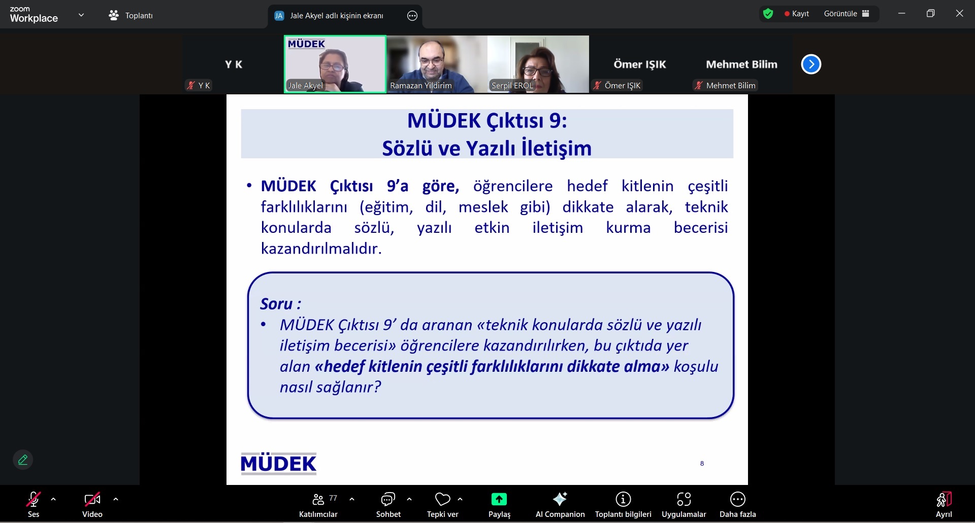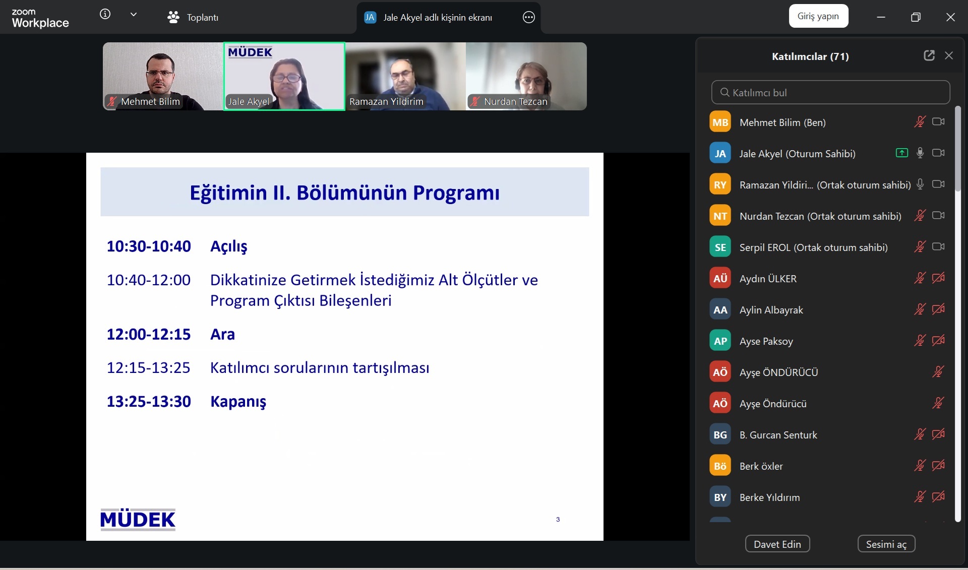 Eğitimin ikinci bölümü ise 07 Mart 2026 Cumartesi günü saat 10.30–13.30 arasında Zoom üzerinden çevrimiçi olarak gerçekleştirilmiştir. Bu bölümde program değerlendirmelerinde sıkça karşılaşılan sorunlar, MÜDEK ölçütlerinin yorumlanması, özdeğerlendirme raporunun hazırlanması ve program değerlendirme sürecine ilişkin konular ele alınmış, MÜDEK eğitimcileri ile görüş alışverişinde bulunulmuştur.