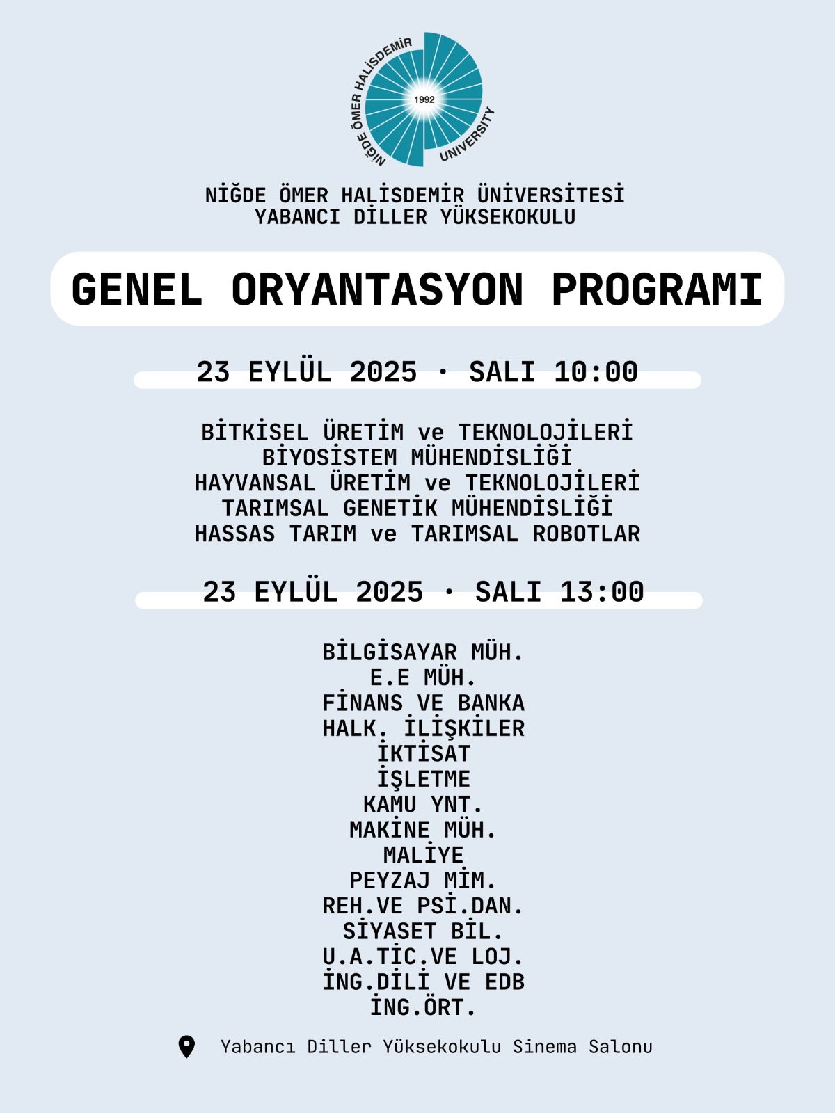 YABANCI DİL HAZIRLIK PROGRAMI GENEL ORYANTASYON PROGRAMI Etkinlik Ayrıntıları Etkinlik Adı: YABANCI DİL HAZIRLIK PROGRAMI GENEL ORYANTASYON PROGRAMI Etkinlik Tarihi: 23.09.2025 - 23.09.2025 Etkinlik Türü: Bilgilendirme Toplantısı Son Güncelleme Tarihi : 03.10.2025