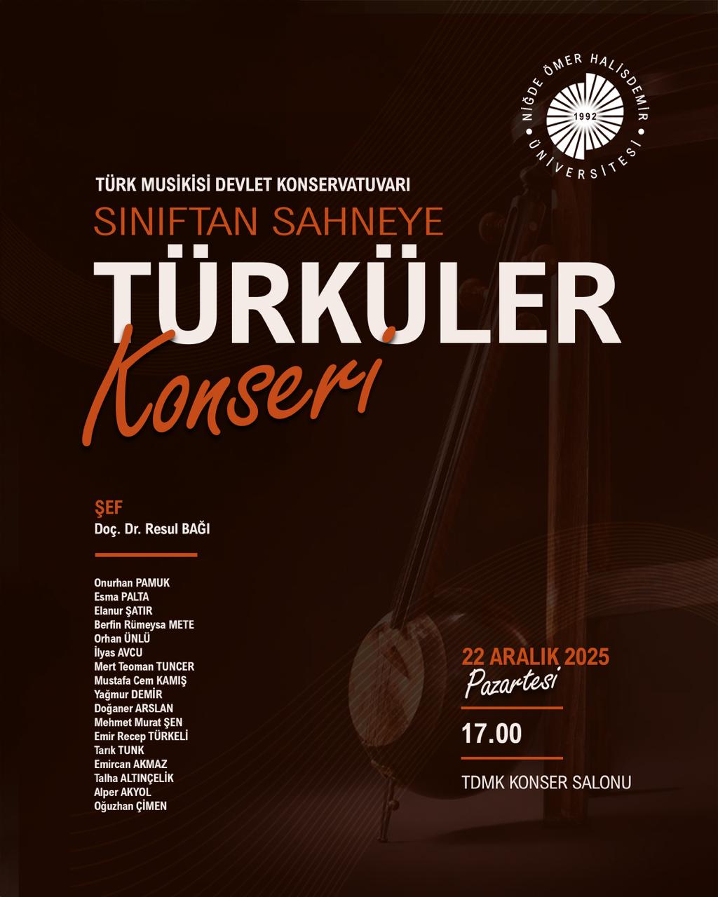 Sınıftan Sahneye Türküler Konseri Etkinlik Ayrıntıları Etkinlik Adı: Sınıftan Sahneye Türküler Konseri Etkinlik Tarihi: 22.12.2025 - 22.12.2025 / 17:00 Etkinlik Türü: Konser Etkinlik Yeri: Türk Musikisi Devlet Konservatuvarı Konser Salonu Türk Musikisi Devlet Konservatuvarı Konser Salonu Son Güncelleme Tarihi : 19.12.2025