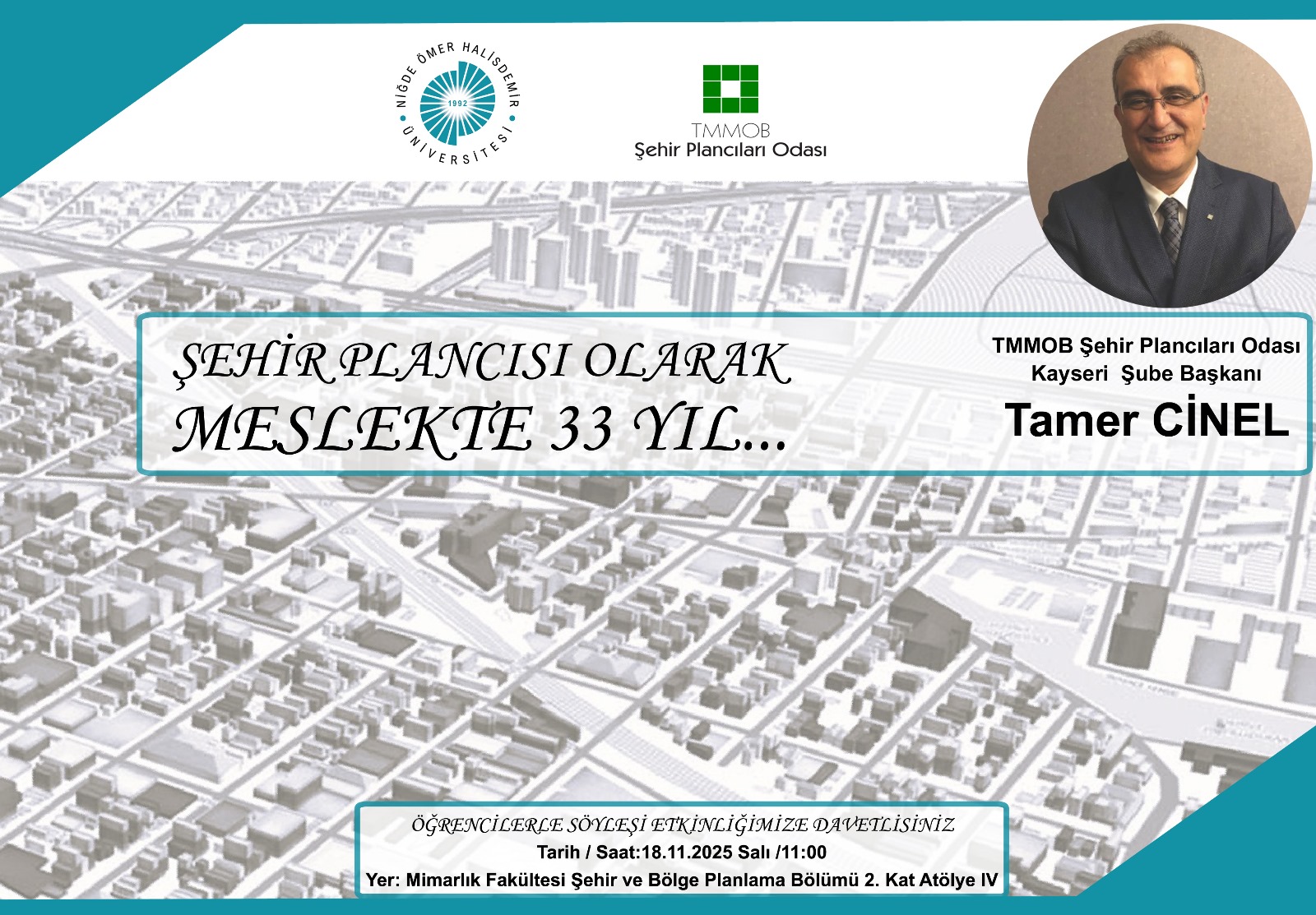 Bölümümüzde, 18 Kasım 2025 tarihinde “Meslek Buluşmaları IV” etkinliği kapsamında “Şehir Plancısı Olarak Meslekte 33 Yıl” konulu bir söyleşi düzenlenmiştir. Etkinliğe, Şehir Plancısı Tamer CİNEL konuşmacı olarak katılarak mesleki deneyimlerini ve tecrübelerini öğrencilerimizle ve diğer katılımcılarla paylaşmışlardır. Etkinliğin gerçekleştirilmesinde katkı sunan tüm akademik personelimize ve katılım gösteren öğrencilerimize teşekkür ederiz.